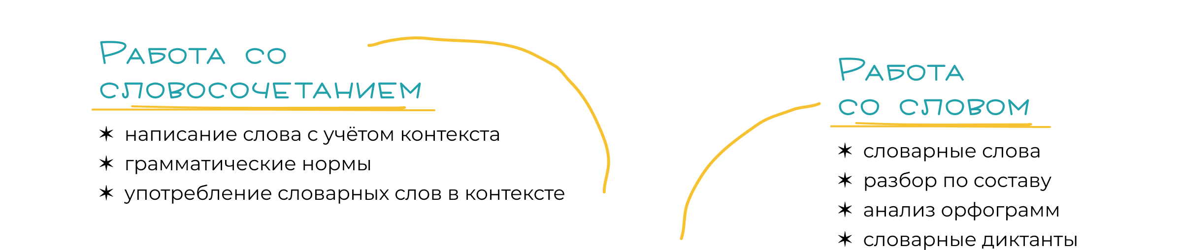 ✓   На каждом занятии комплексно работать со словом, словосочетанием, предложением. Ребятам предстоит писать диктанты, разбирать слова по составу, определять признаки частей речи, анализировать написание слова и условия постановки знаков препинания, запоминать и повторять словарные слова